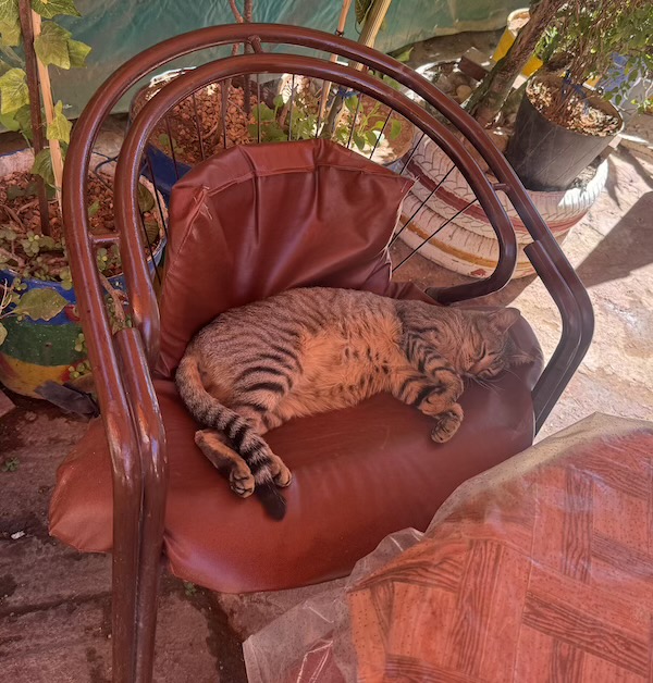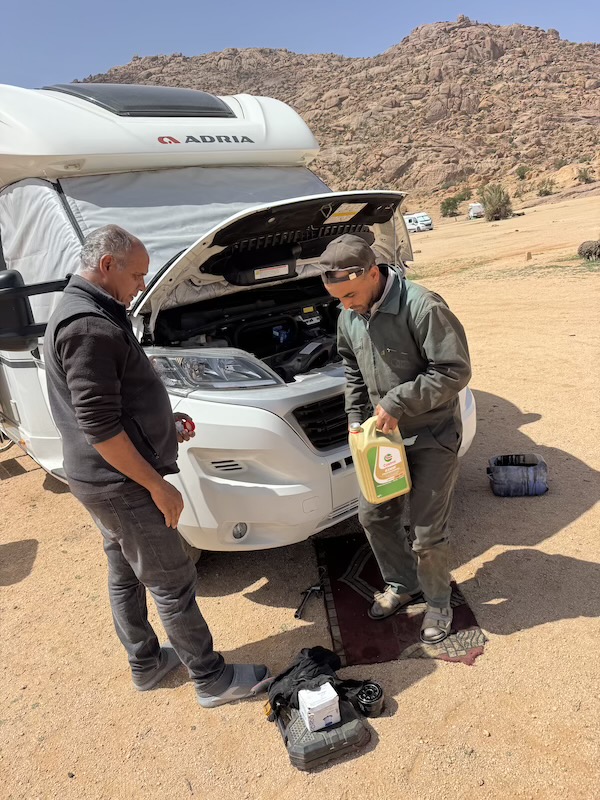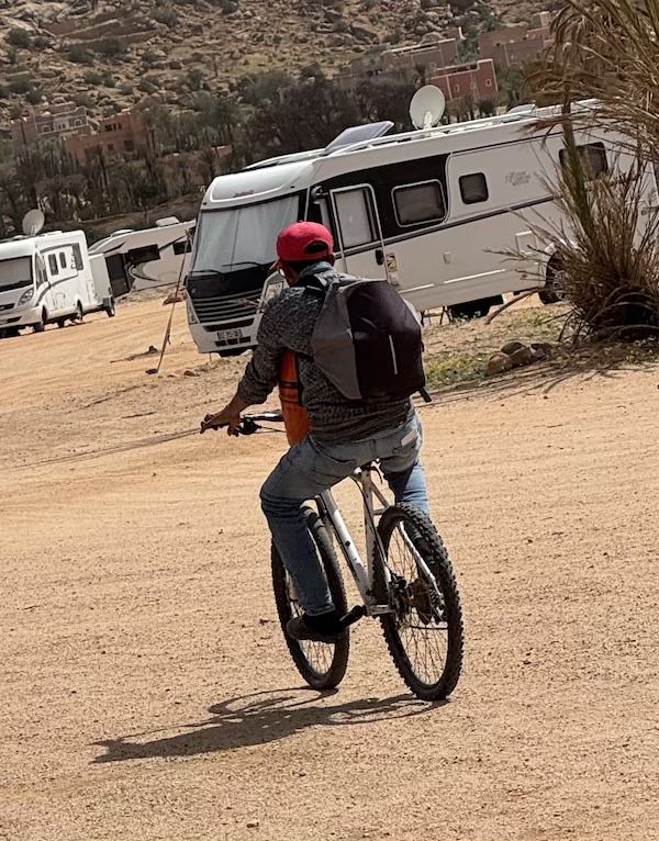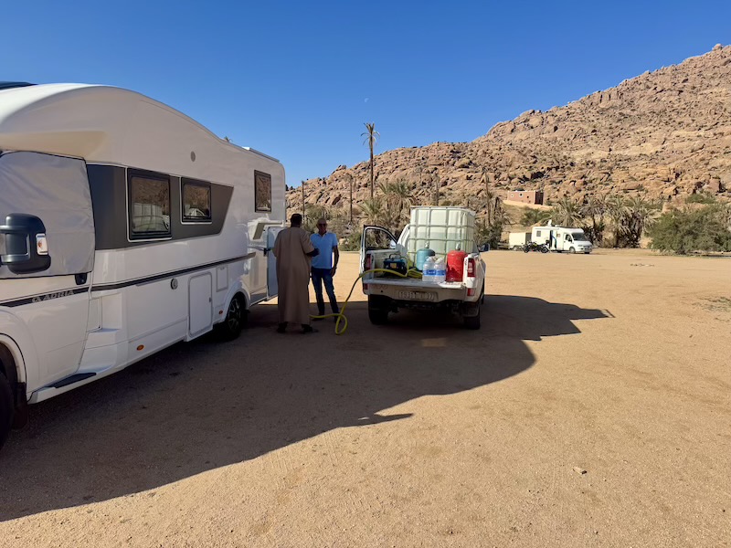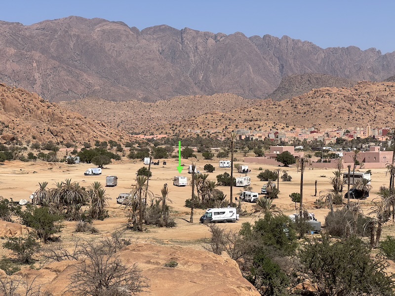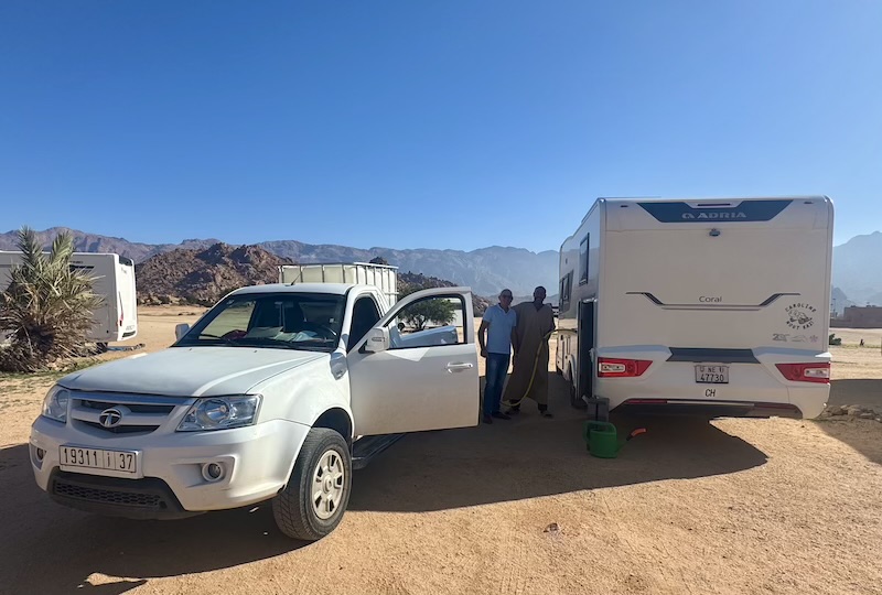 Dormir hors camping à Tafraoute, c’est à dire dans la palmeraie, n’est pas un problème. Y dormir coûte 1,5 euros car il y a des gardiens qui veillent toute la nuit. Mais le mieux, est que nous pouvons avoir presque tous les services sur place car les habitants se sont organisés. On y voit passer 2 fois par jour le boulanger à vélo pour le pain frais, le garage Vrai Momo (car il y en a deux à Tafraoute de Momo), les oeufs frais, les crèpes faitent maison, la livraison d’eau potable, la livraison d’excellente tajine, la lessive , le remplissage des bouteilles de gaz propane et j’en oublie sans doute. Mis à part le coiffeur, nous avons utilisé tous ces services avec grand plaisir et satisfaction. Et bien entendu, il y a les épiceries diverses et les boucheries au village, de même qu’une aire de service pour les toilettes et les eaux grises du camping-car.