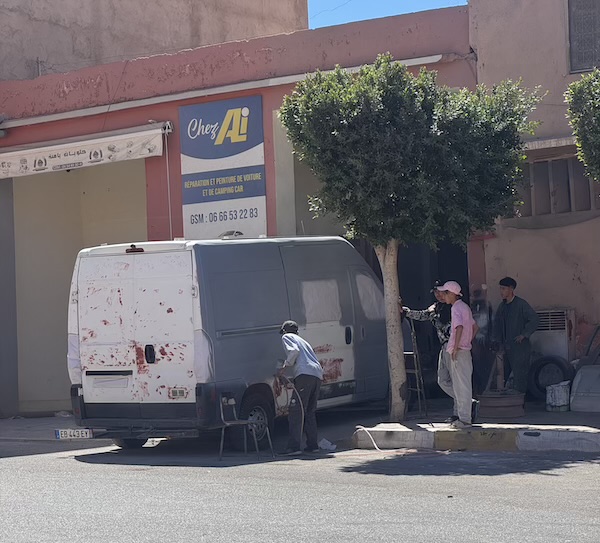 Ici pas de cabine de peinture. On fait cela dans la rue !