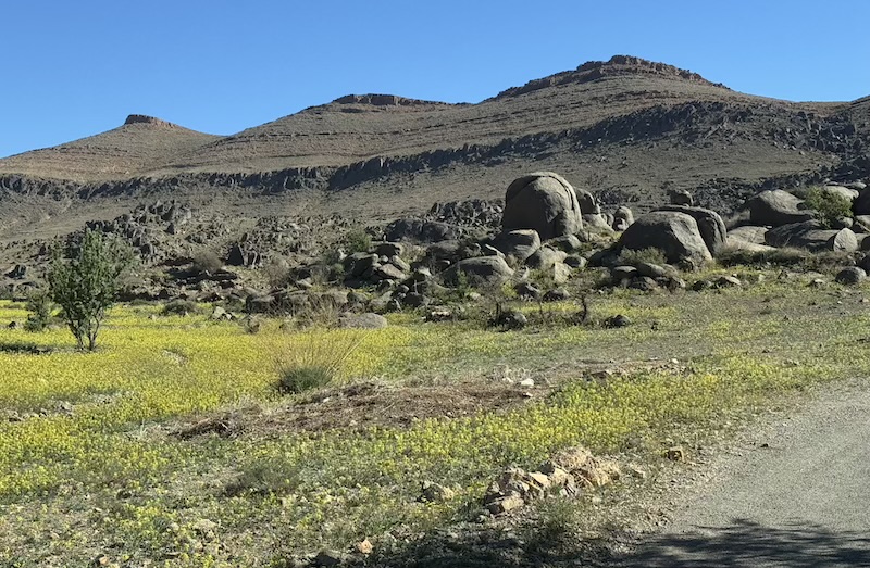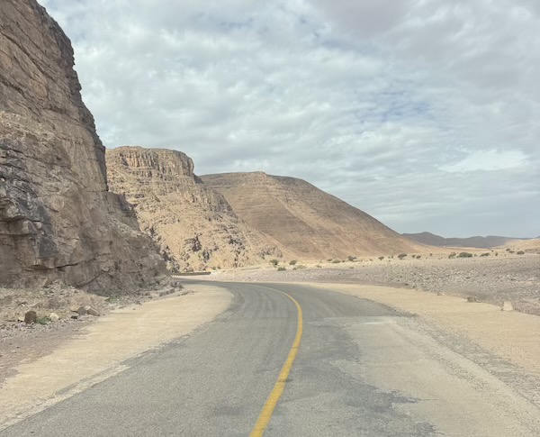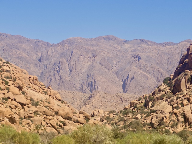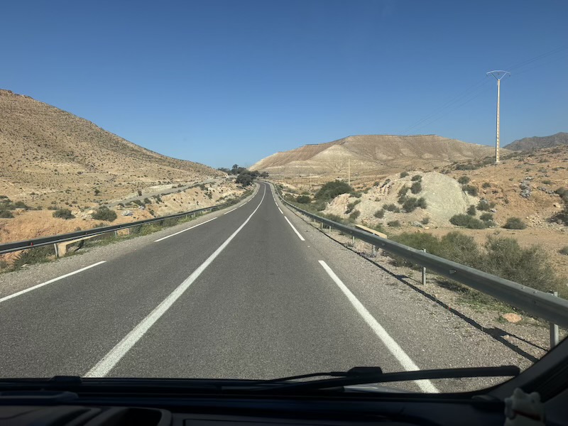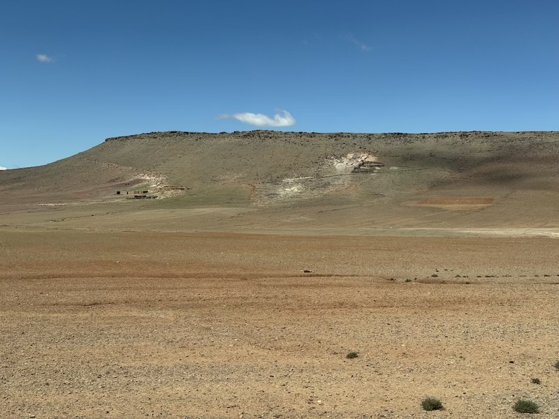 C’est avec un beau ciel bleu que nous quittons Tafraoute. Nous traversons les hauts plateaux en prenant une petite route qui nous fait traverser de jolis paysages variés mais au combien venteux. Au final, nous croiserons que deux véhicules sur cette route ! Arrivé en bas, c’est le vent de sable qui nous accompagne jusqu’à Foum Zguid, lieu où nous passerons la nuit.