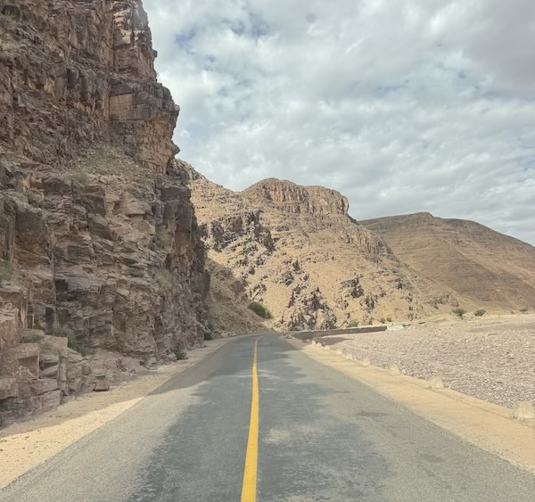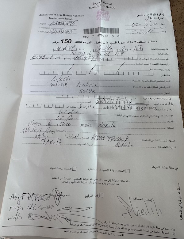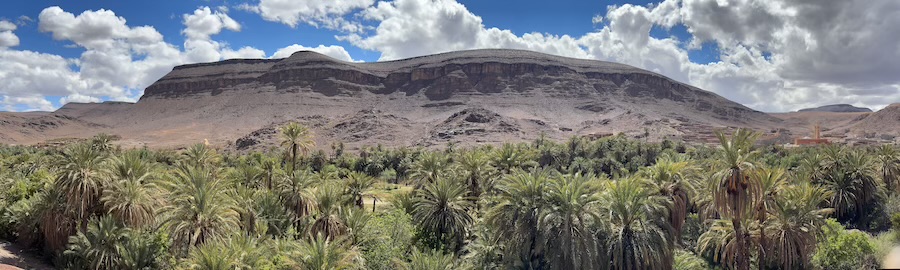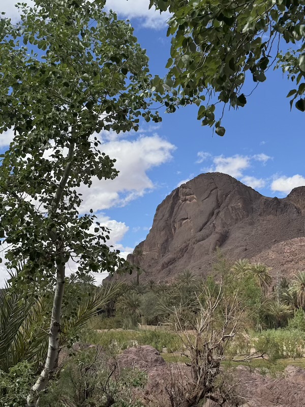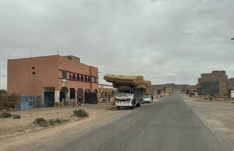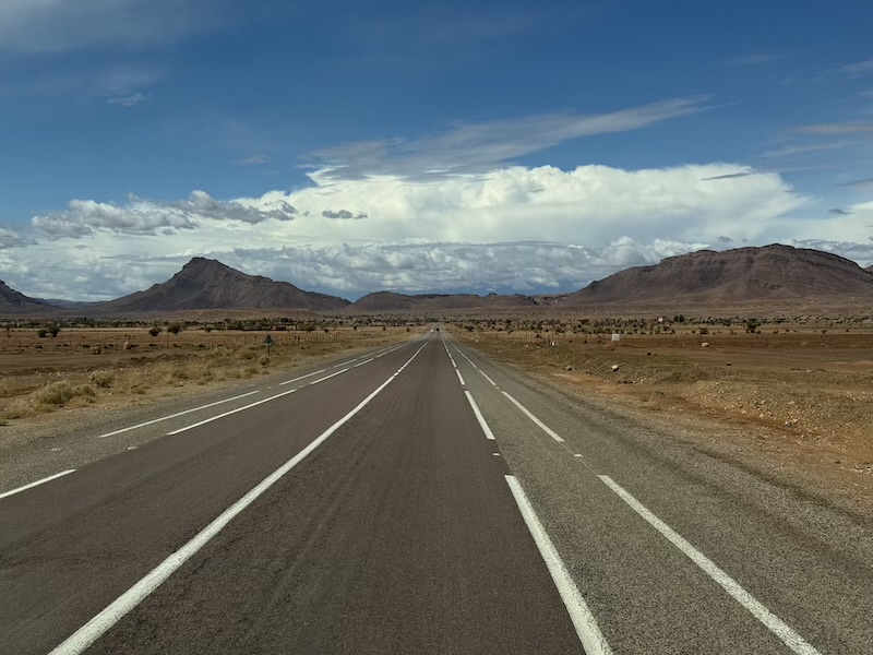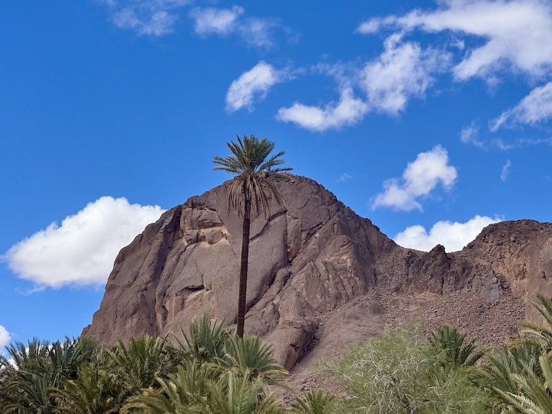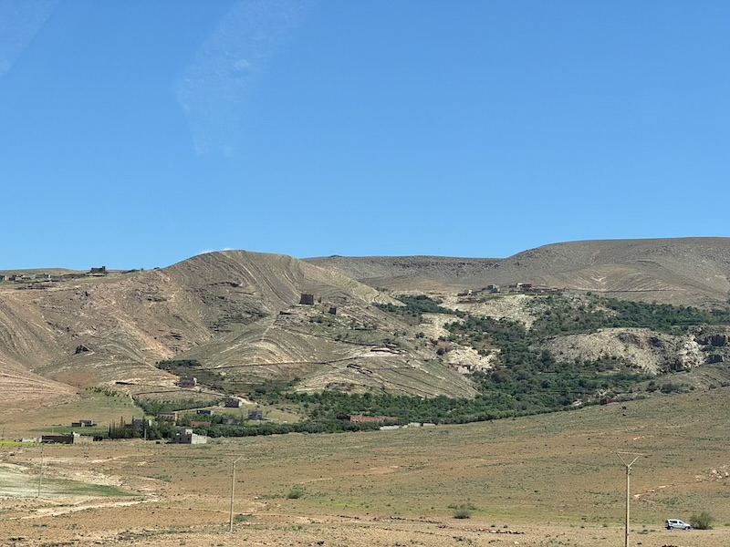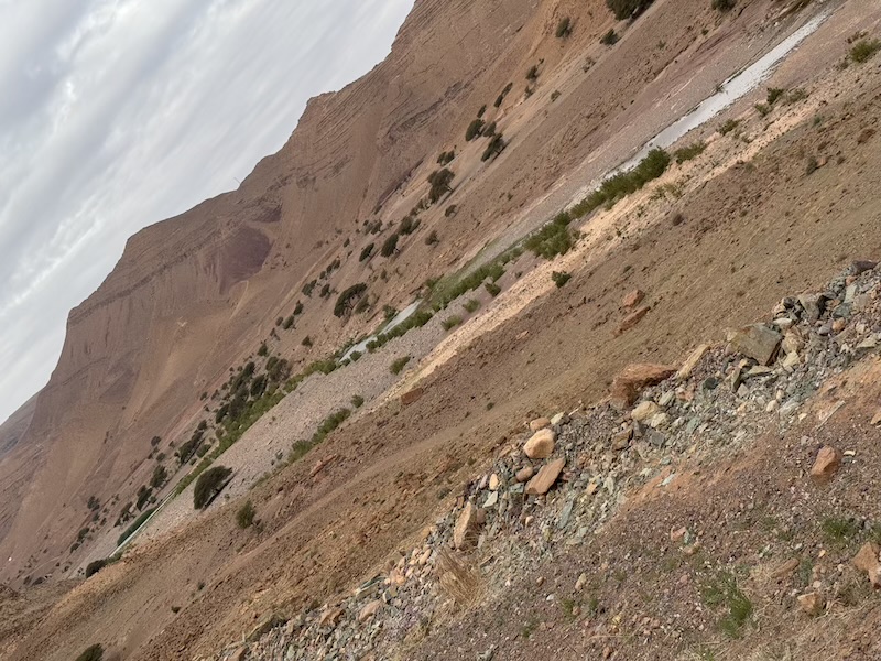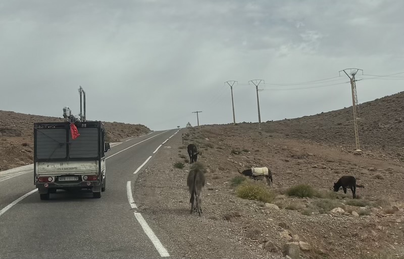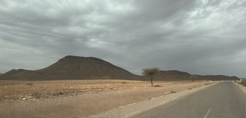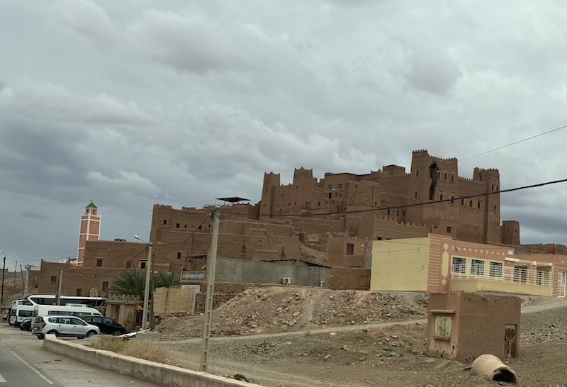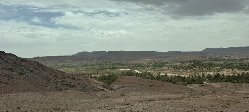 Nous poursuivons notre chemin sur une route inédite pour Ouarzazate mais avec un temps maussade et où il pleut un peu d’eau et un peu d’amende ! Nous voyons assez souvent de petites oasis.