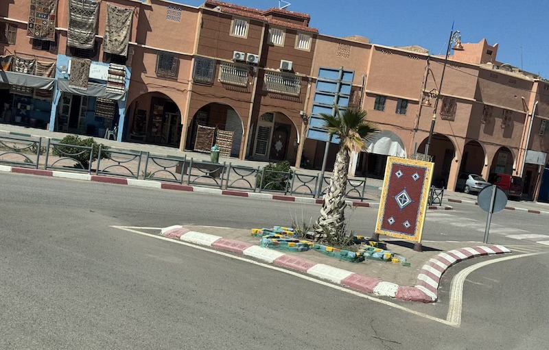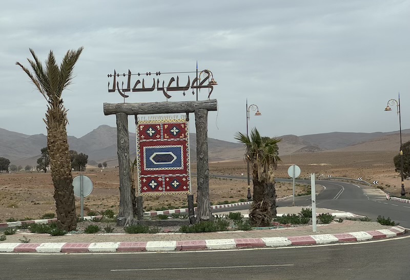 Nous voici à Tazenakht, ville référence pour le tapis berbère. Cela se voit ! A droite direction Ouarzazate et à gauche direction Agadir, route que nous prenons.