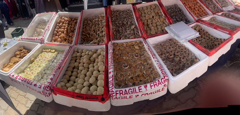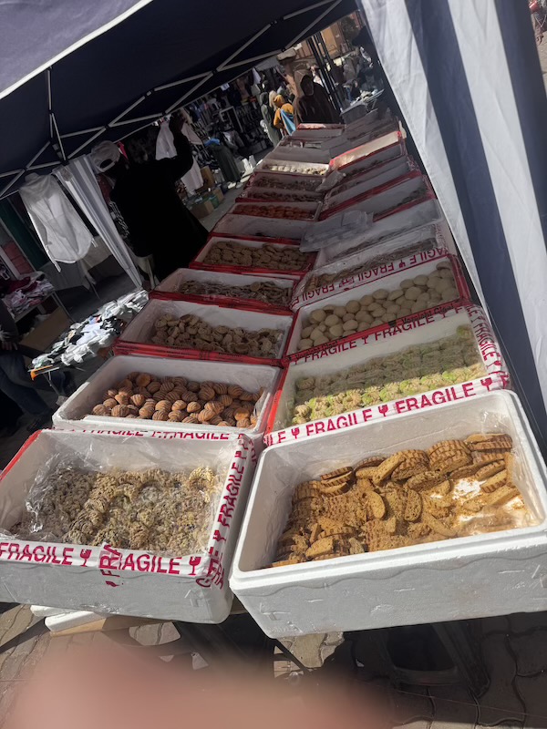 Petit tour au souk. La fin du ramadan est proche et les étalages de biscuits pour la fête sont bien garnis.
