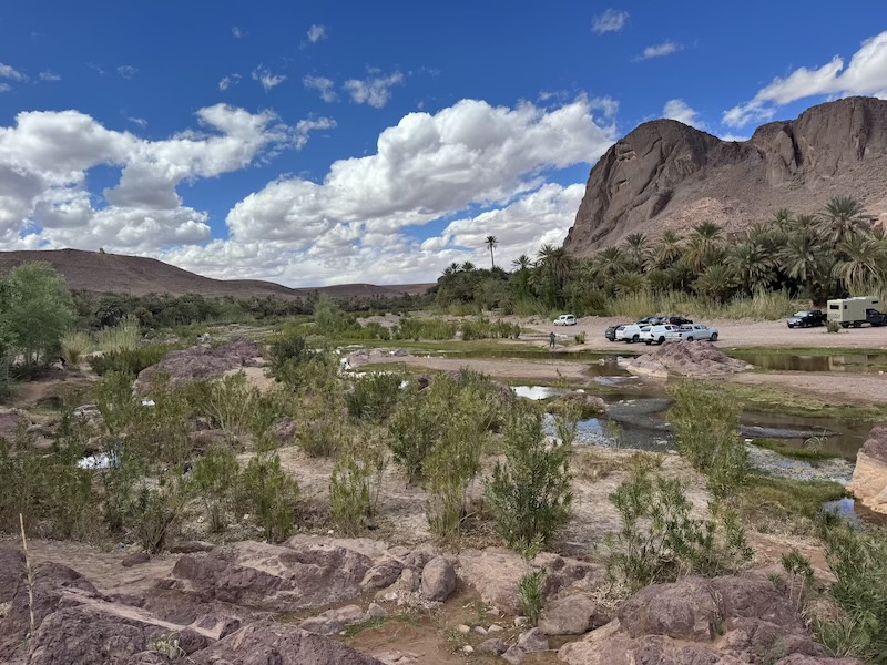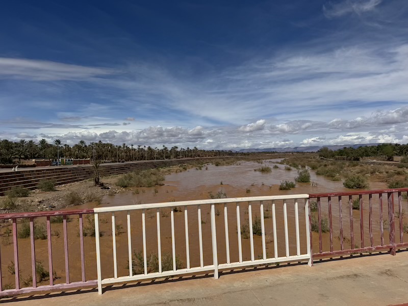 L’oued de Foum Zguid est en eau. Le propriétaire du camping nous a dit qu’il était impossible de le traverser jusqu’à 4h ce matin. Il le sait car il s’est fait piégé hier soir au village de Foum Zguid.