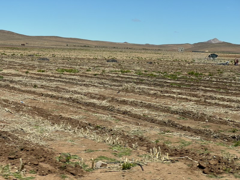 La route pour Tata étant coupée suite aux grosses pluies, nous devons changer d’itinéraire et prendre une autre route. Nous empruntons la route qui mène à Taliouine, Taroudant et au final pour arriver à Takate, lieu que nous connaissons bien. Nous traversons de hauts plateaux. Après le désert, retour de la verdure. Nous nous arrêtons à Taliouine, lieu emblématique pour le safran marocain. Le temps est revenu nettement plus clément.