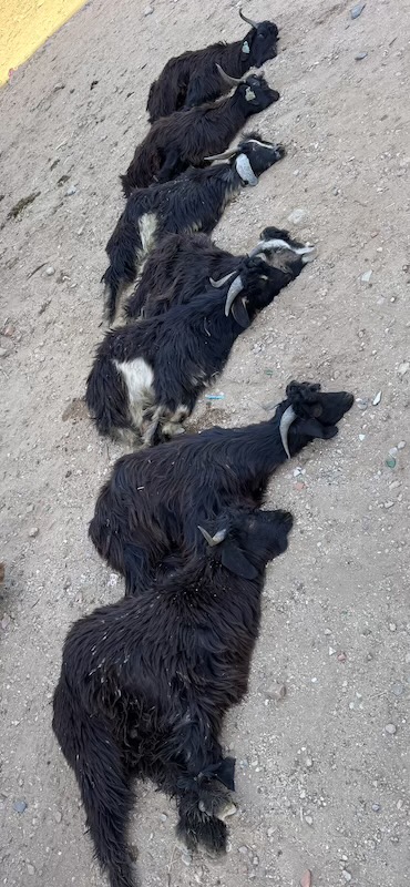 Ces chèvres ne sont pas mortes. Les pattes sont attachées afin qu’elles ne s’enfuient pas.