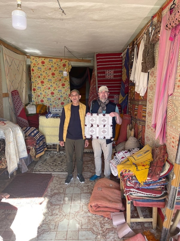Guillaume a fait marché le commerce local de tapis. En cadeau, il reçoit un coussin marocain.