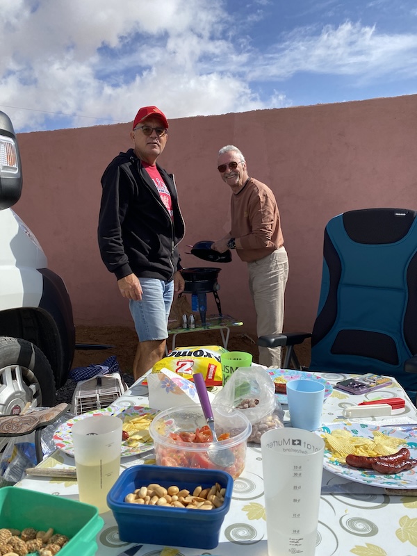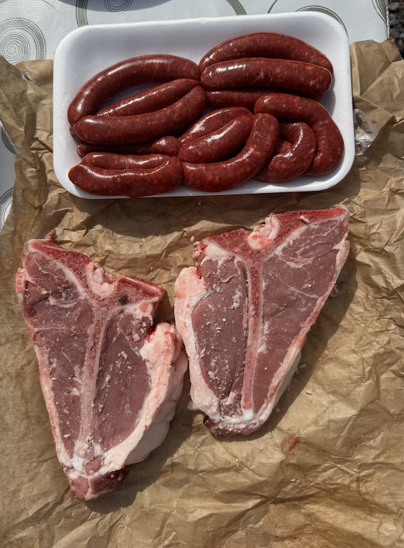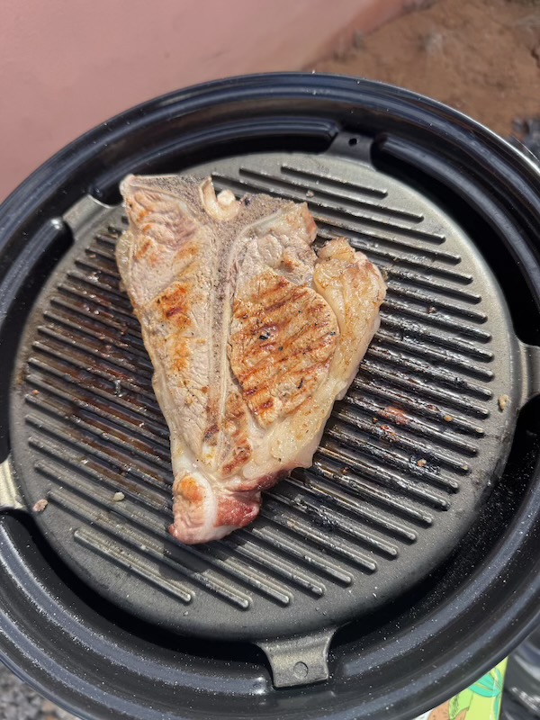 Arrivé au camping, une grillade s’impose ! Tbone steak de dromadaire et merguez.