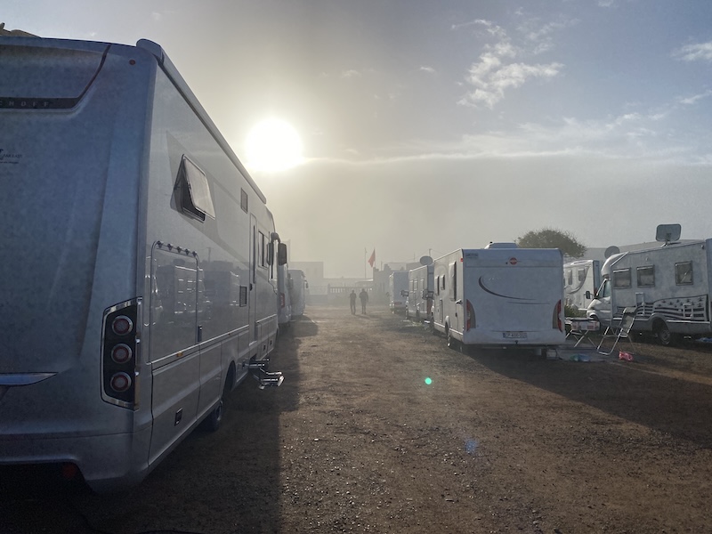 La brume du matin sur Sidi Ifni. On aperçoit les chauffeurs de ces dames revenir de la réception.