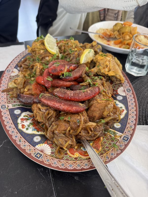 Là, vous ne voyez que la viande, il y avait encore un autre grand plat avec les légumes et la sauce et un dernier avec la semoule fine. Excellent !!