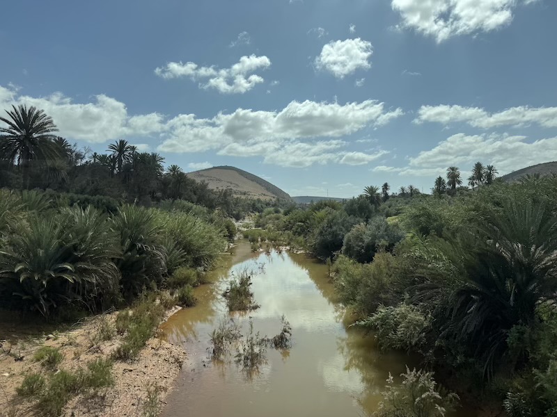 Nous remontons en suivant l’oued perdu dans la palmeraie.